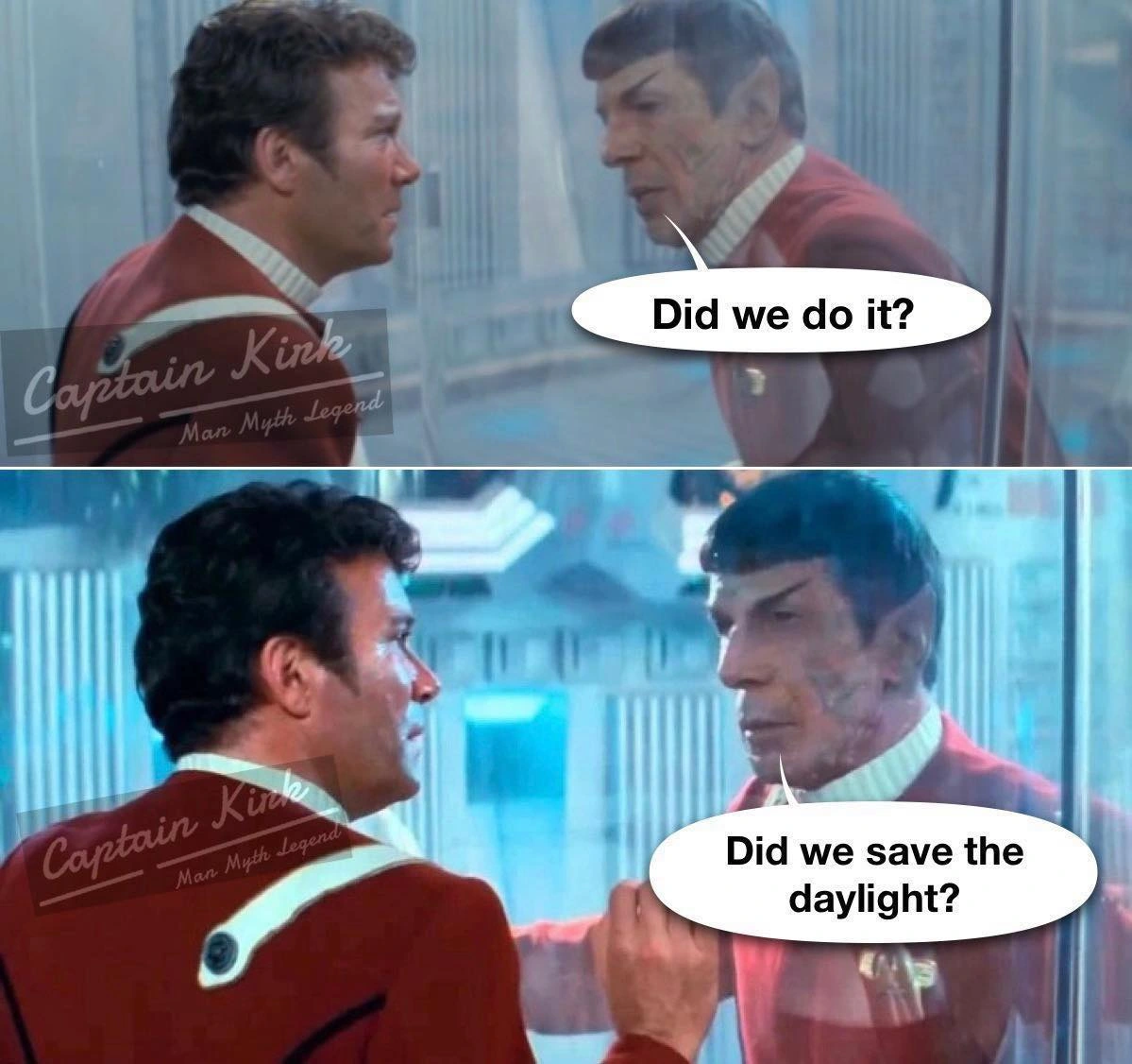 Spock and Kirk. Spock asks, “Did we do it? Did we save the daylight?”