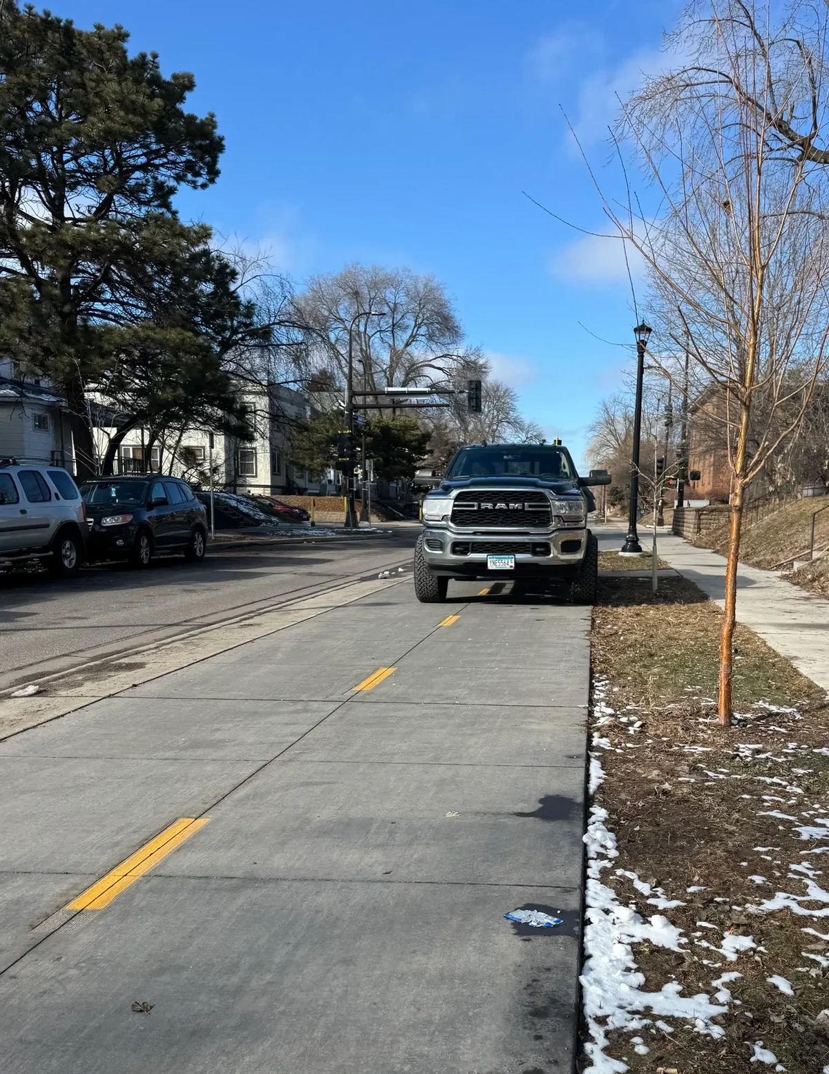 Dodge Ram truck is illegally parked on Bryant Ave S protected bikelane, Minneapolis.
