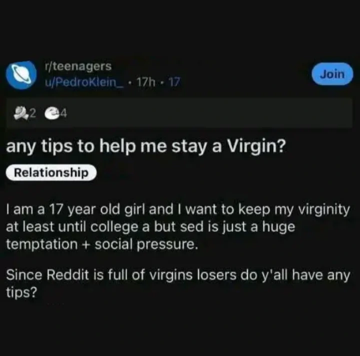 Screenshot of a Reddit post from r/teenagers. The title reads, “any tips to help me stay a Virgin?”