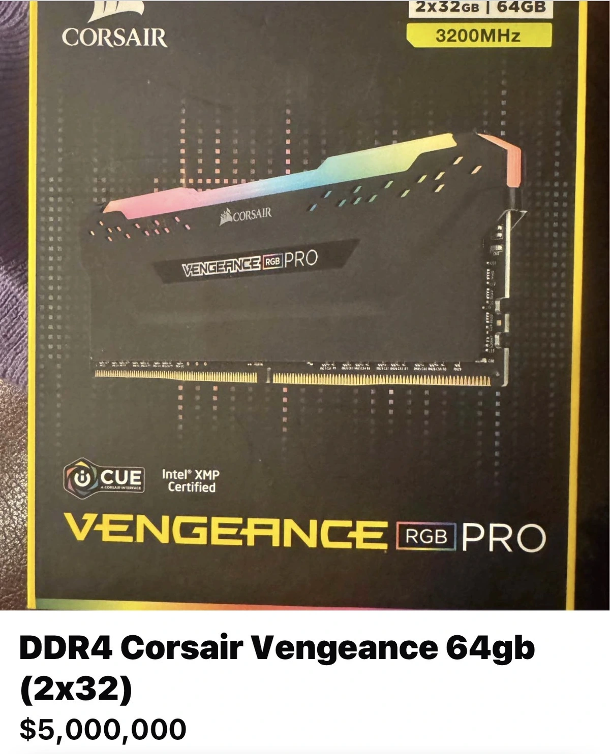 Box of 64GB Corsair DDR4 marketplace listing for $5,000,000.
