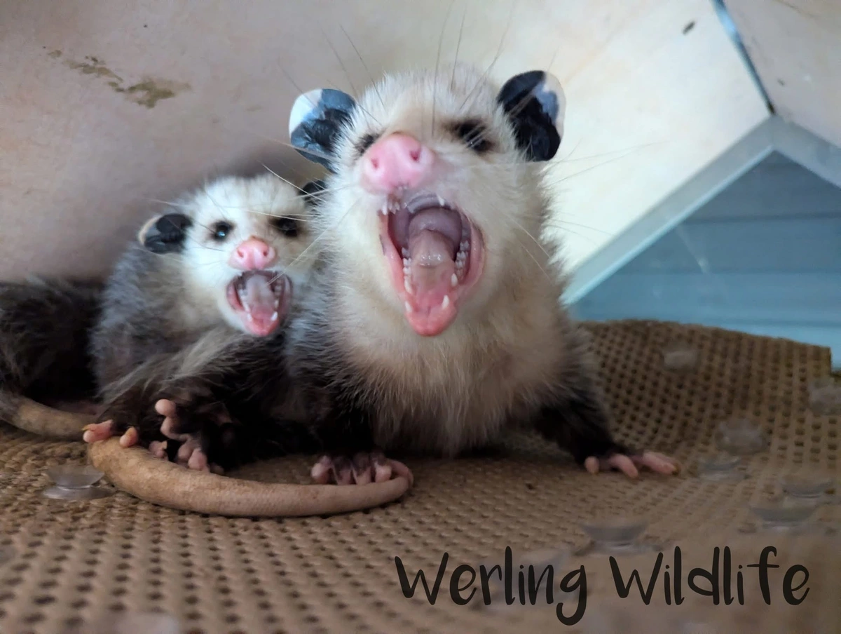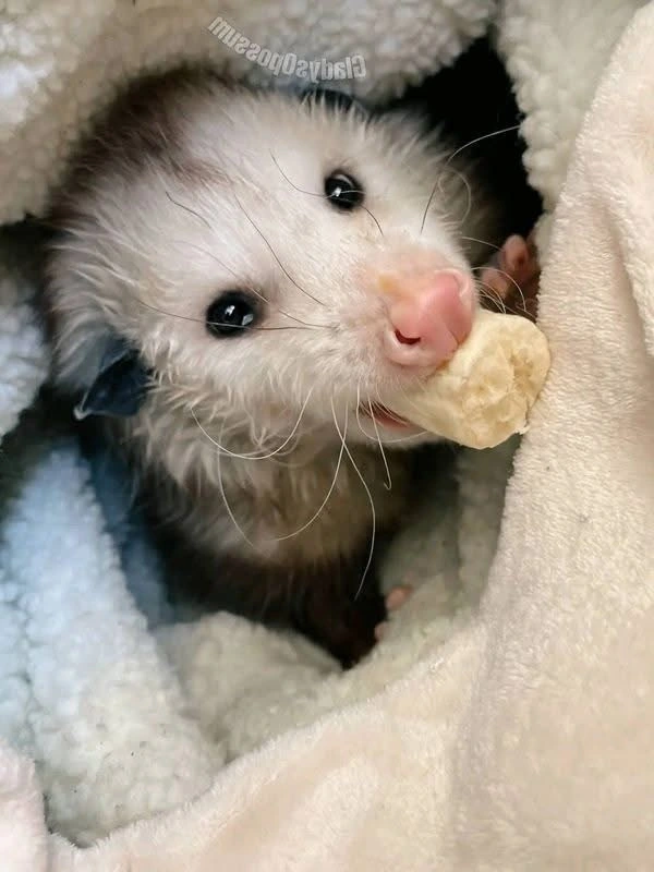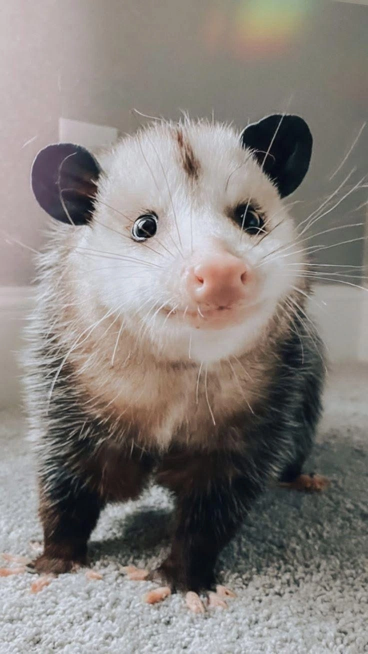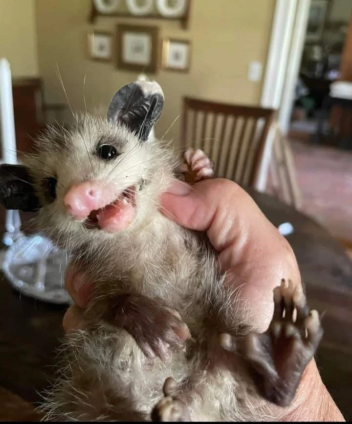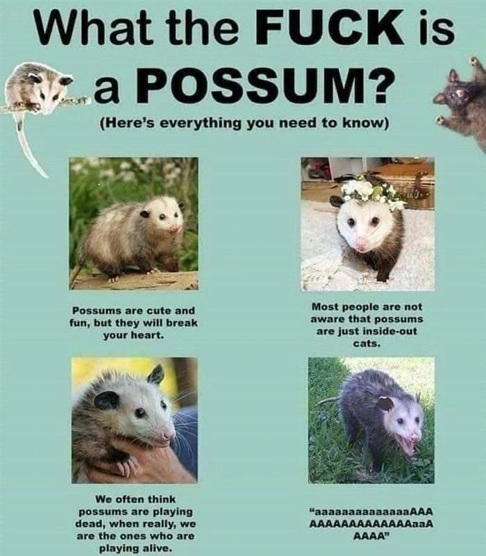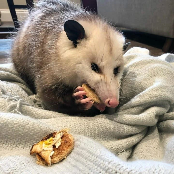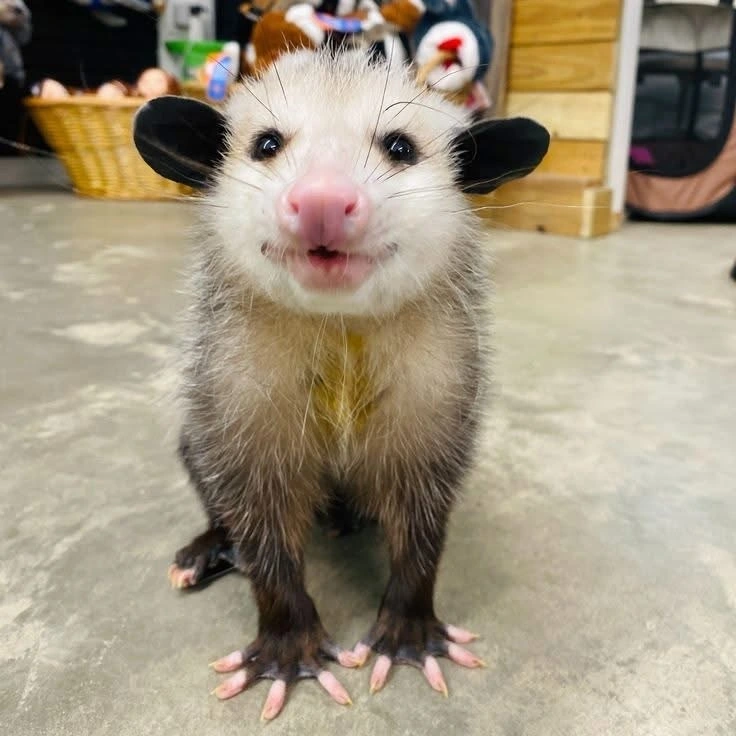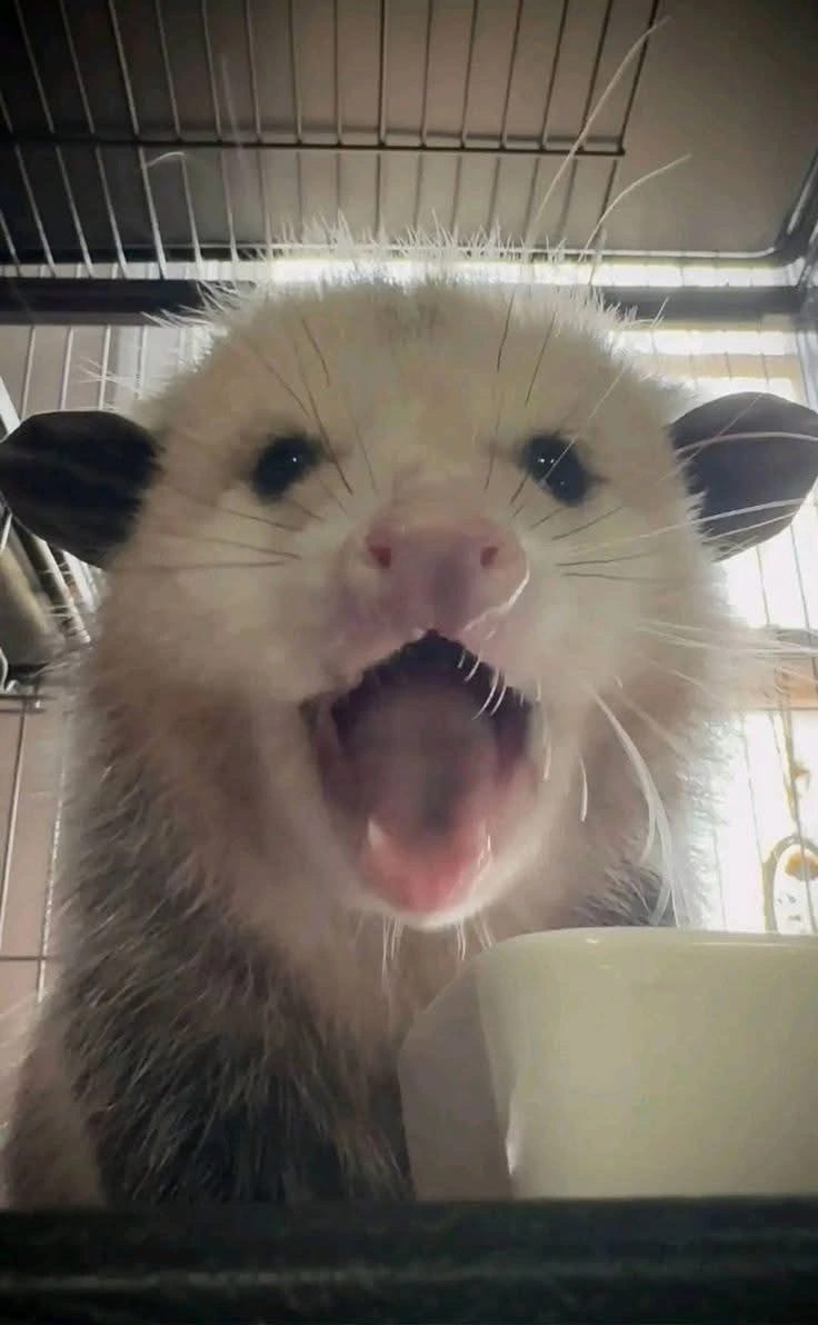 TranscriptionA 4-panel picture of an opossum. Panels 1, 3 and 4 have the close-up of the opossum’s face. Panel 2 has a picture of the possum yawning with a mouth wide open.