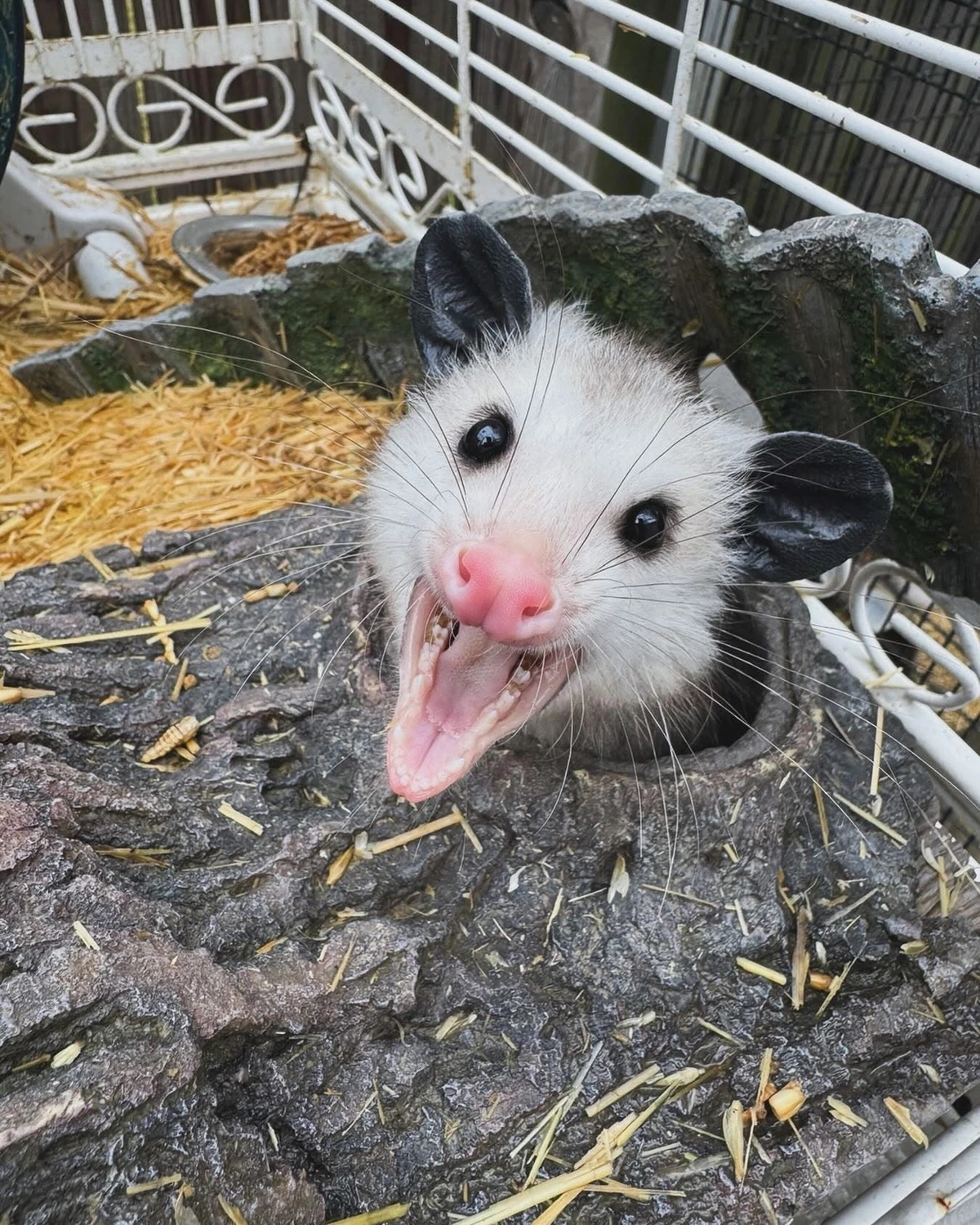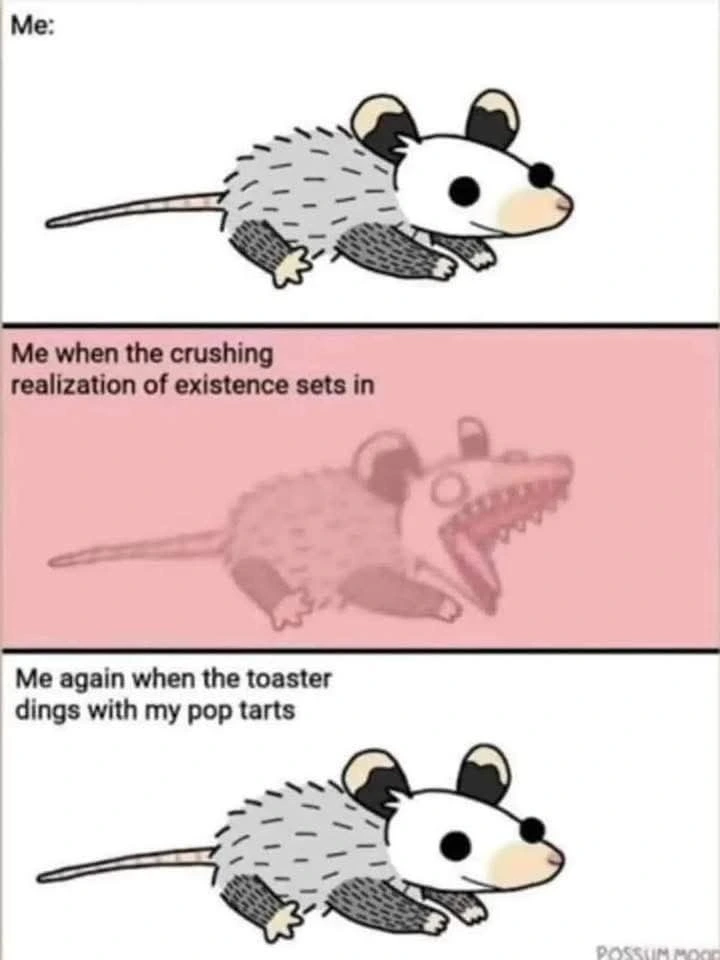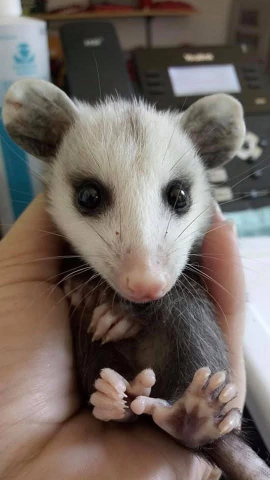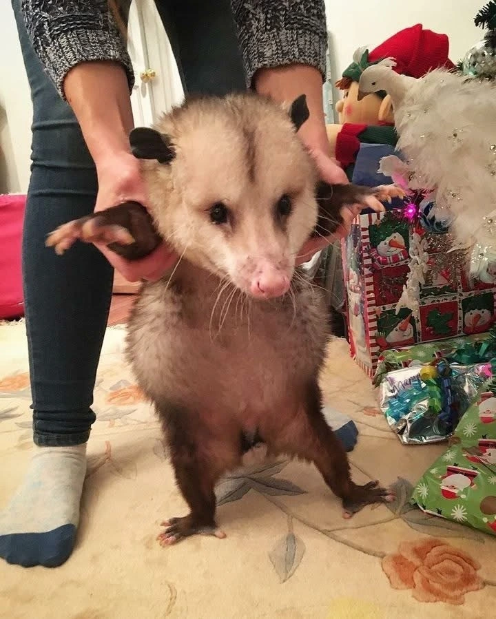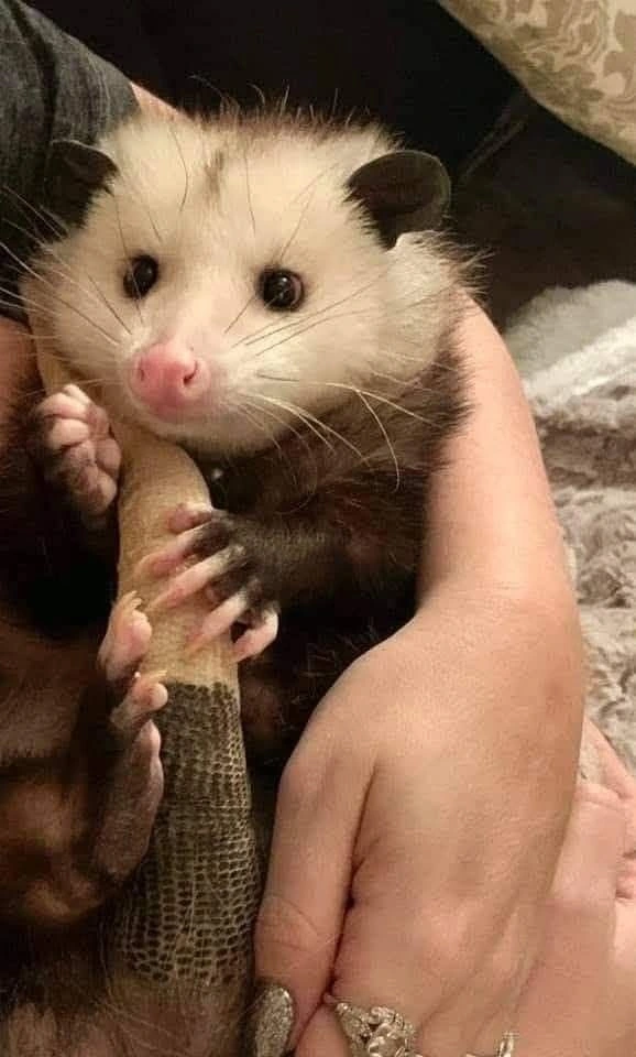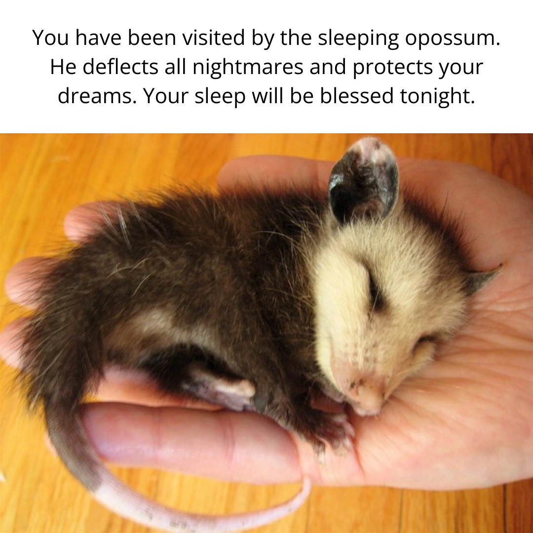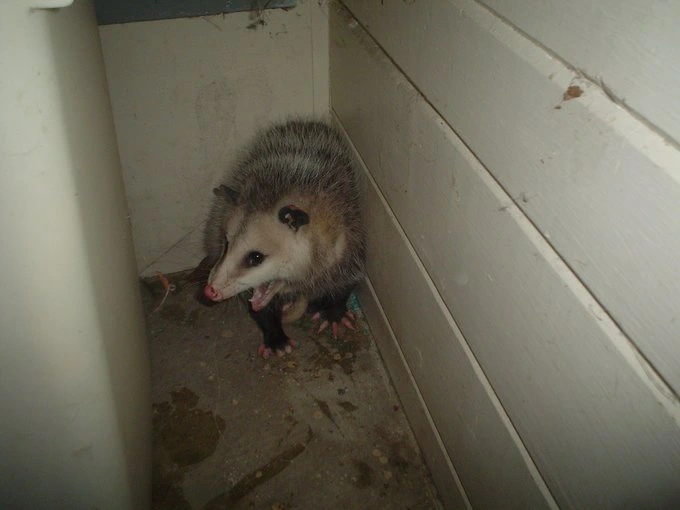 TranscriptionA 4-panel picture of an opossum. Panels 1, 3 and 4 have the close-up of the opossum’s face. Panel 2 has a picture of the possum yawning with a mouth wide open.