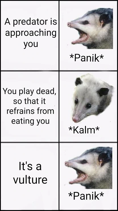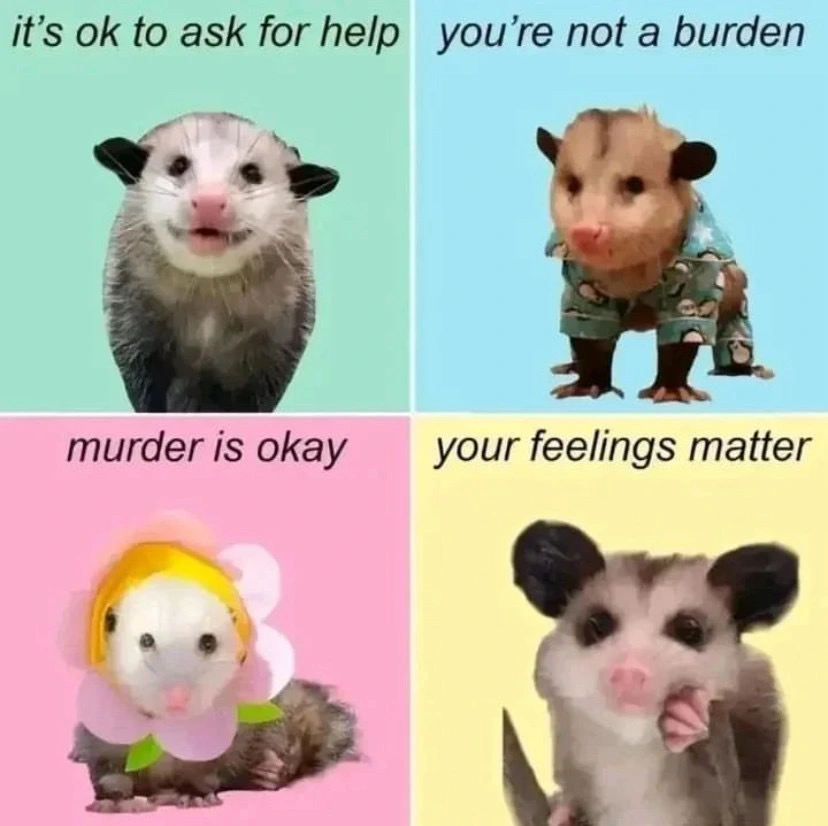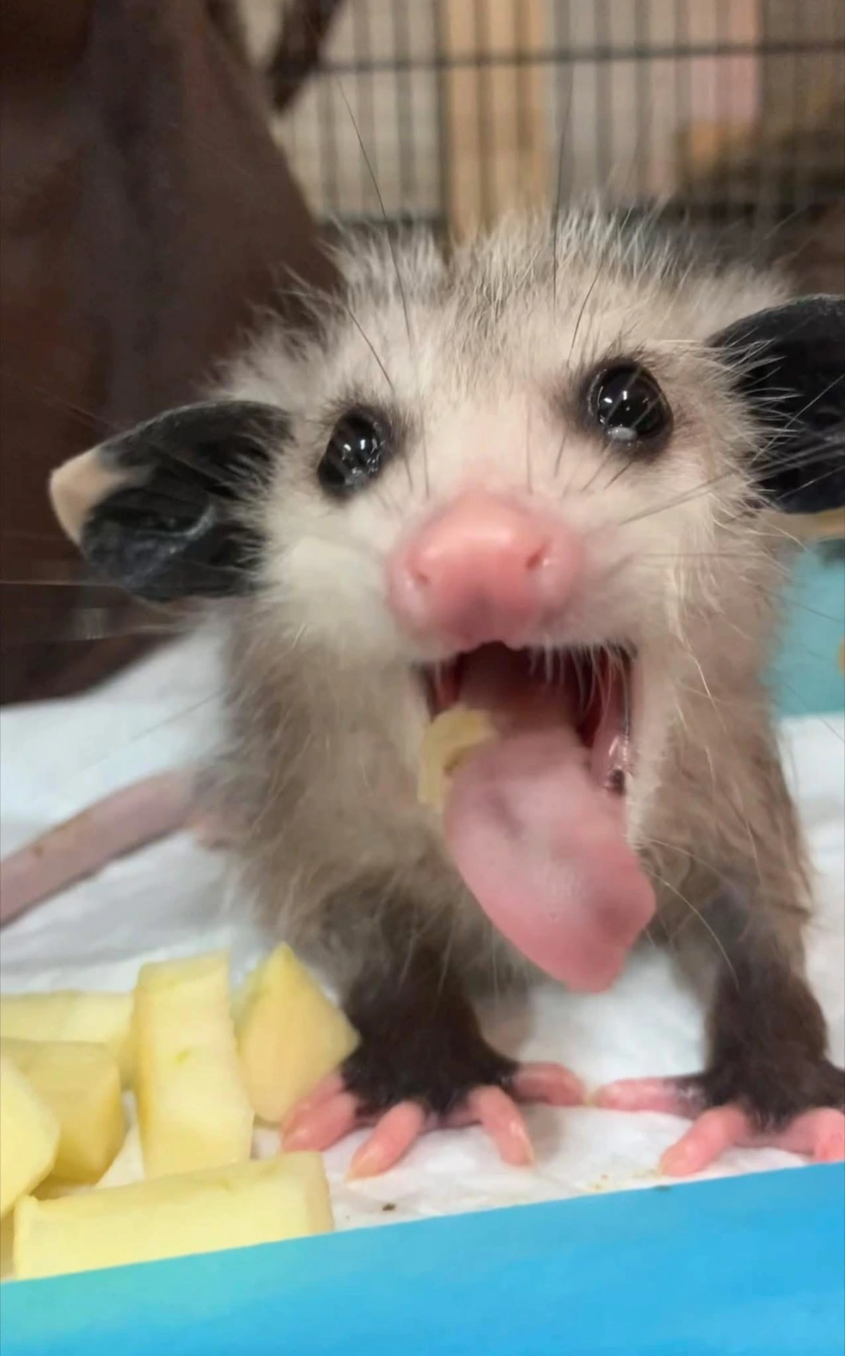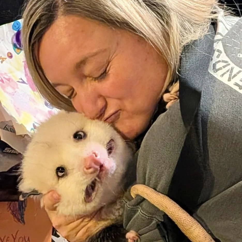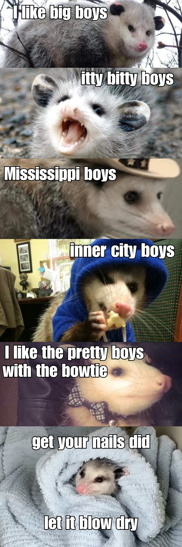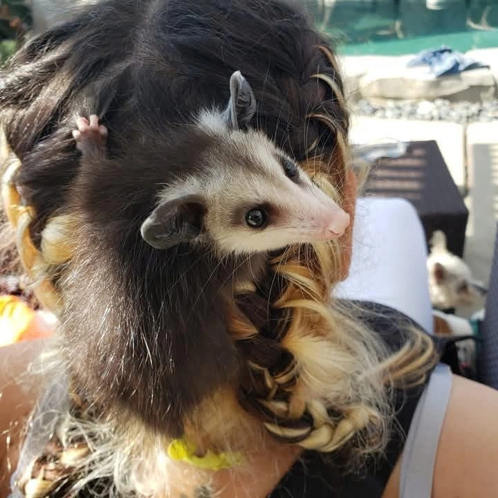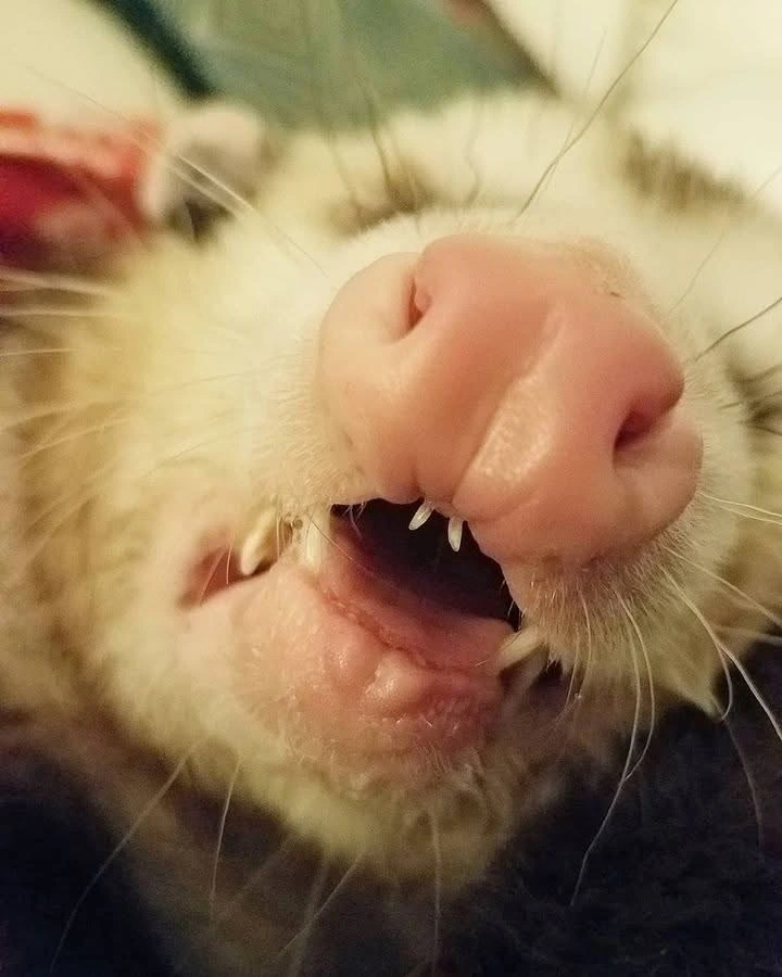 TranscriptionA 4-panel picture of an opossum. Panels 1, 3 and 4 have the close-up of the opossum’s face. Panel 2 has a picture of the possum yawning with a mouth wide open.