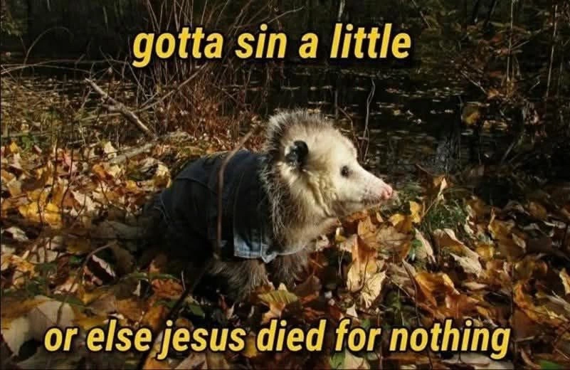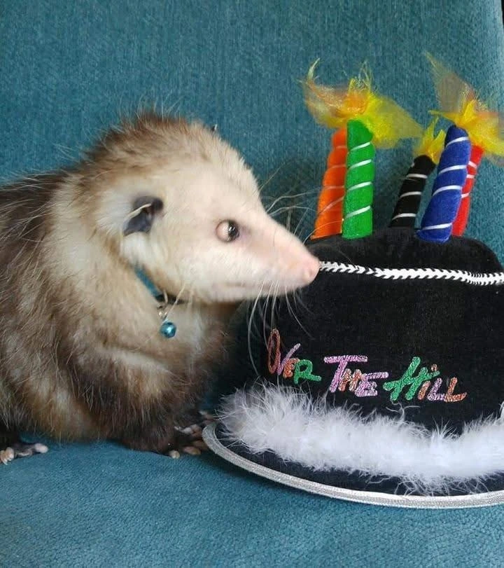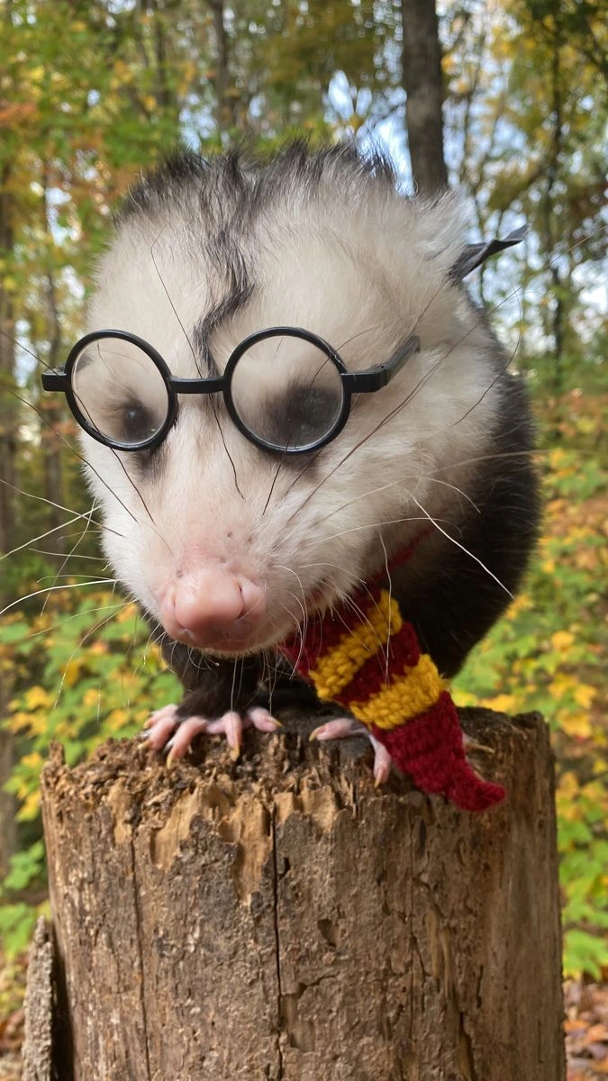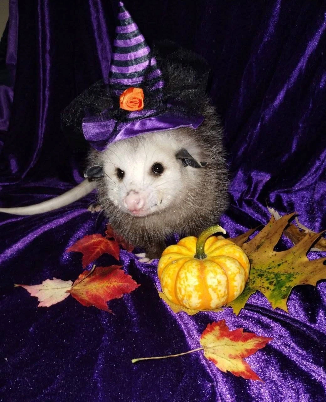 TranscriptionA picture of a cute opossum wearing a black and purple witch hat. Behind him is a purple velvet background. In front of him is a small pumpkin and scattered autumn leaves.