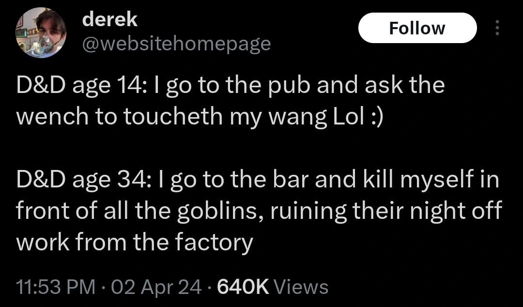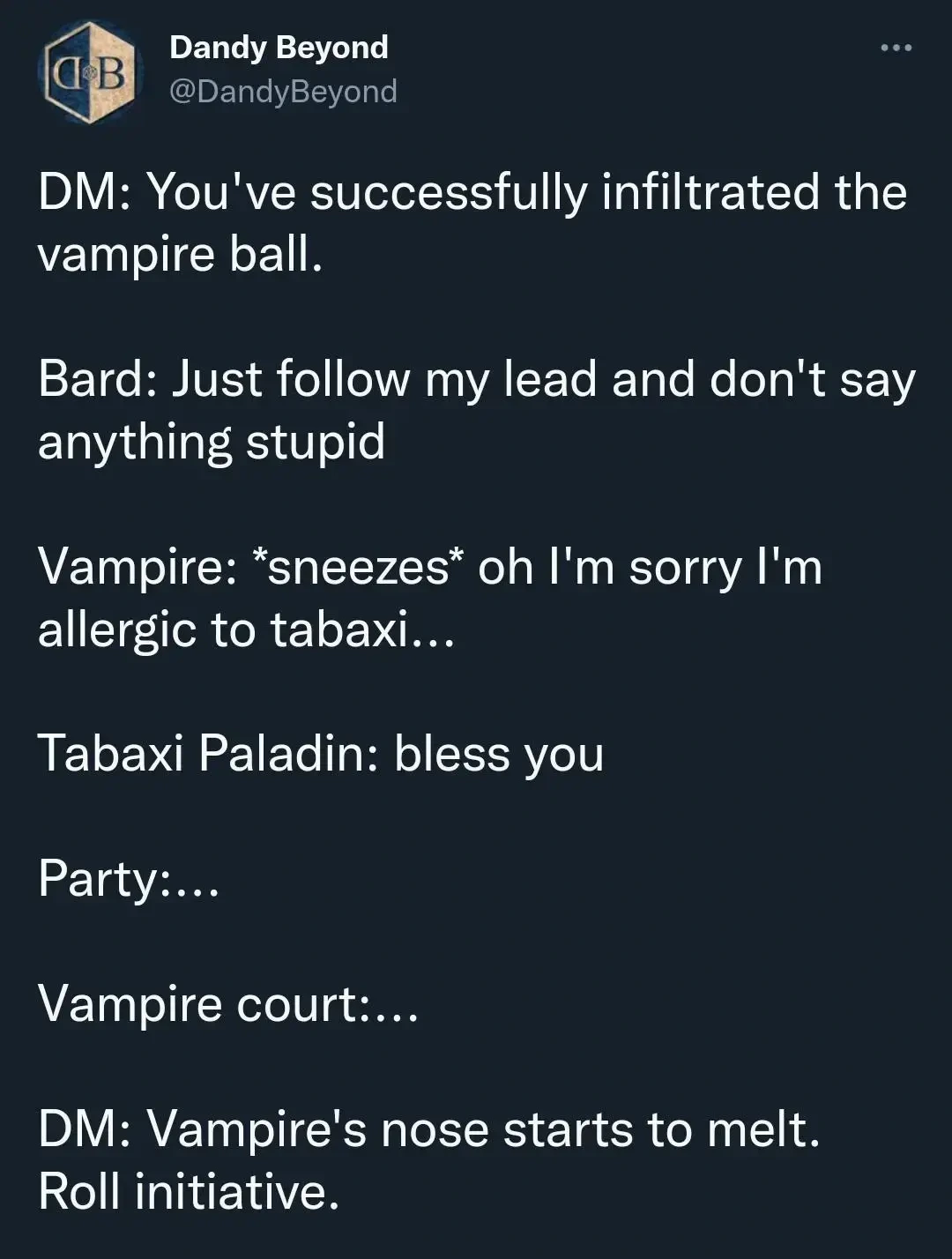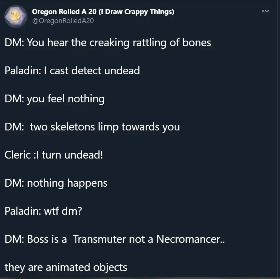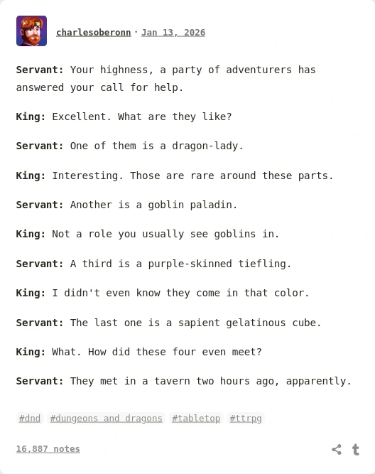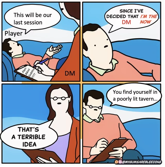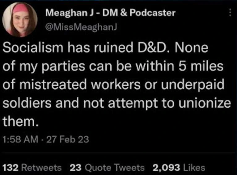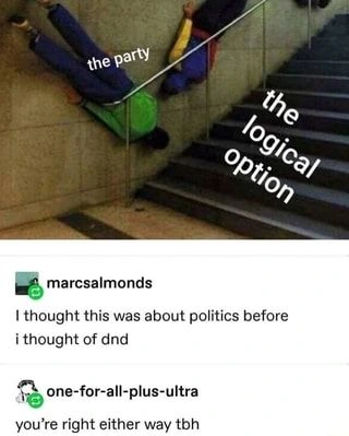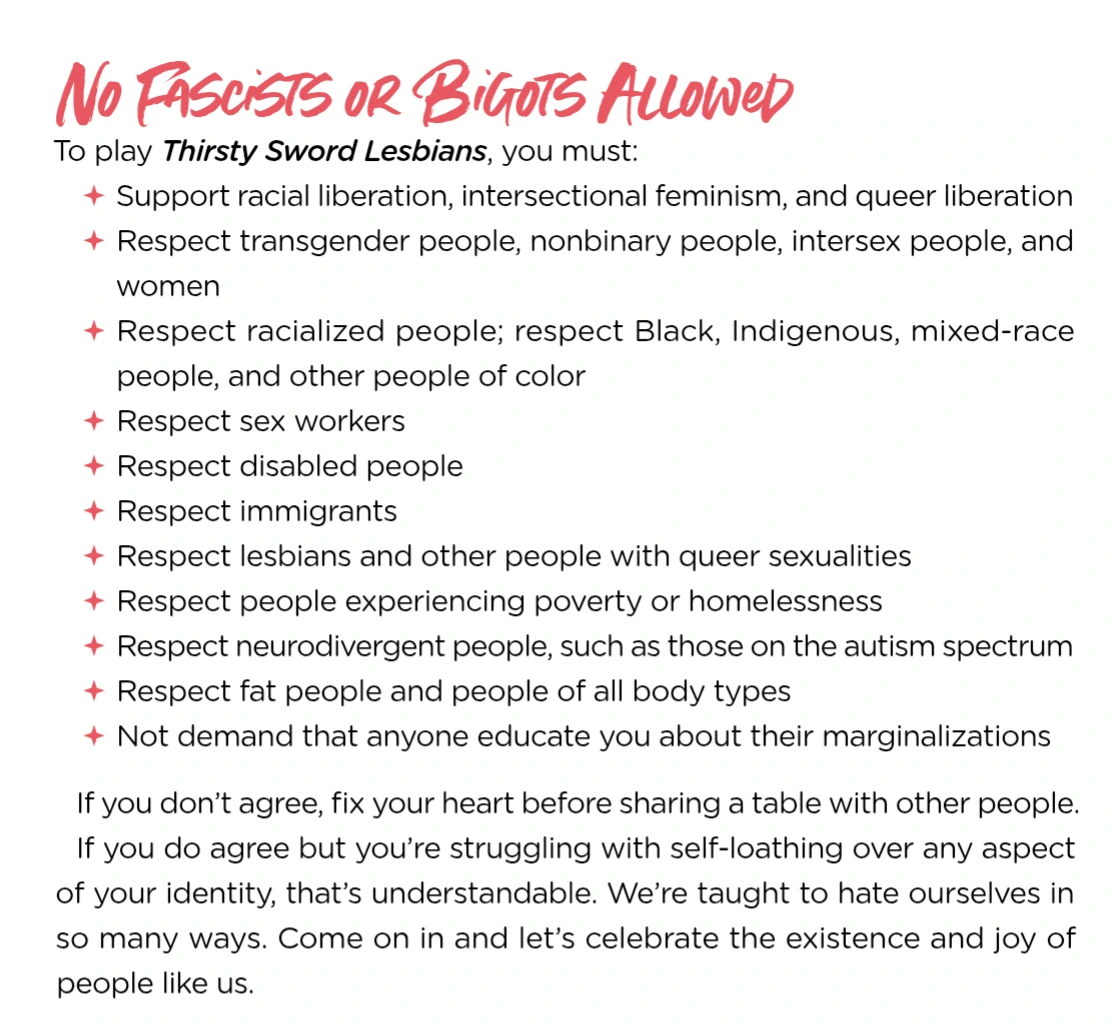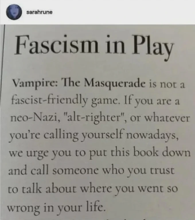 Seriously. Every form of entertainment has baked-in political assumptions, and that definitely includes #ttrpg . You might choose not to examine them, but this is an active choice on your part, and you donβt get to pretend that your entertainment is βfree of politicsβ.
