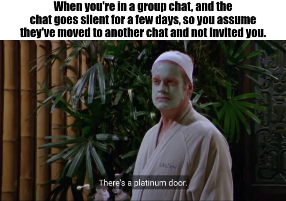 Alt Text: The text above the image reads “When you’re in a group chat, and the chat goes silent for a few days, so you assume they’ve moved to another chat and not invited you.” Image is of Frasier in a spa, wearing a mud mask and robe, with a suspicious look on his face noting that “there’s a platinum door”.